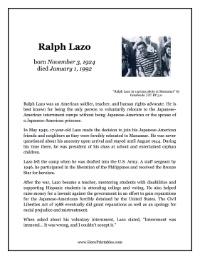 Ralph Lazo, peaceful dissenter against and prisoner of the Japanese-American internment camps, is celebrated in this printable hero biography.